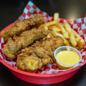 Homemade breaded chicken fingers marinated in seasoned buttermilk, served with fries.